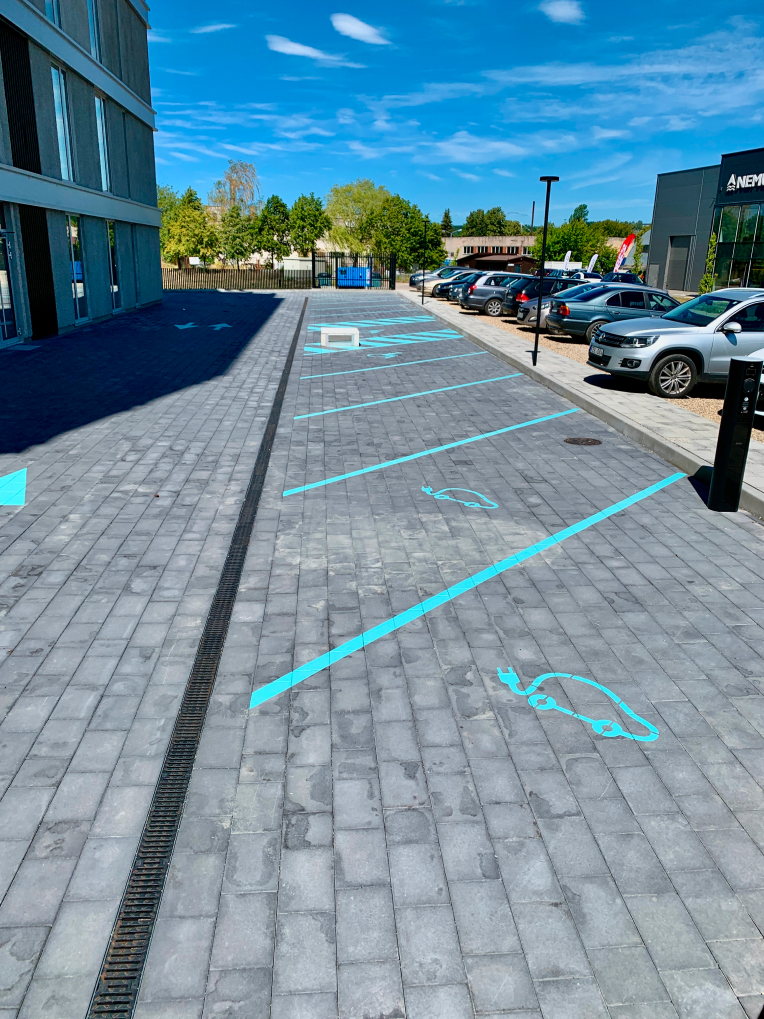 Kaune naujai pastatytame gyvenamųjų namų kvartele „Upės apartamentai“ įrengtos požeminė ir lauko automobilių stovėjimo aikštelės. Siekiant išlaikyti nuoseklų projekto stilių, horizontalus ženklinimas atliktas netipiniais, turkio spalvos, dažais.