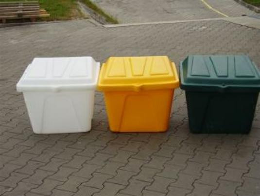 Dėžės žvyro druskos mišiniui pagamintos iš vidutinio tankio polietileno (MDPE), naudojant rotacinio formavimo technologiją.
