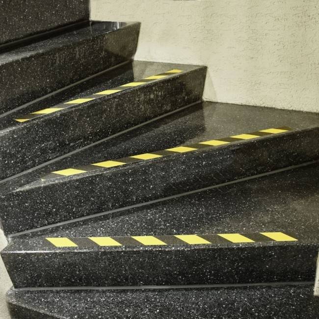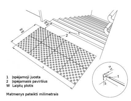 Pagal STR 2.03.01:2001 “STATINIAI IR TERITORIJOS. REIKALAVIMAI ŽMONIŲ SU NEGALIA REIKMĖMS” ir ISO 21542:2011 standarto reikalavimus laiptų pakopos turi būti ženklinamos 50mm pločio ir laipto pakopos ilgio geltonos spalvos juosta.