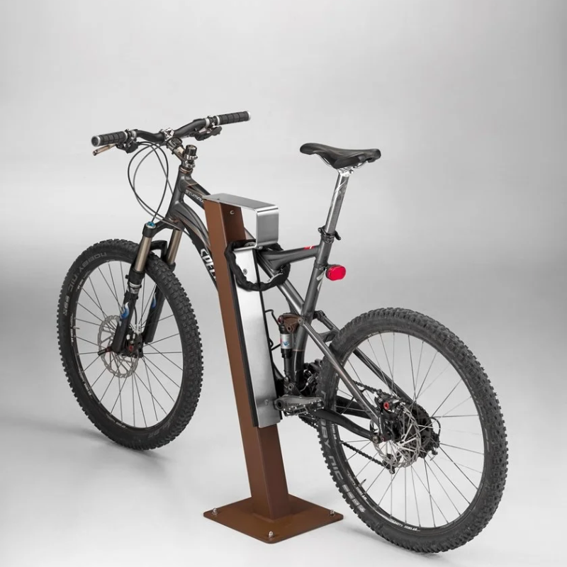 Dviračių stovas, sudarytas iš kvadratinio plieninio vamzdžio ir nerūdijančio plieno ąselės, leidžiančios patogiai prirakinti spyną. Dviratis prie stovo rakinamas ties vairu, taip nepažeidžiant stipinų. Išilgai stovo pritvirtinta guma, apsauganti rėmą nuo subraižymų. Dviračių laikiklis gali būti įvairių spalvų arba pagamintas iš corten plieno.