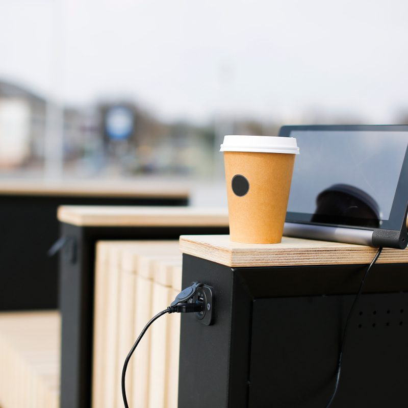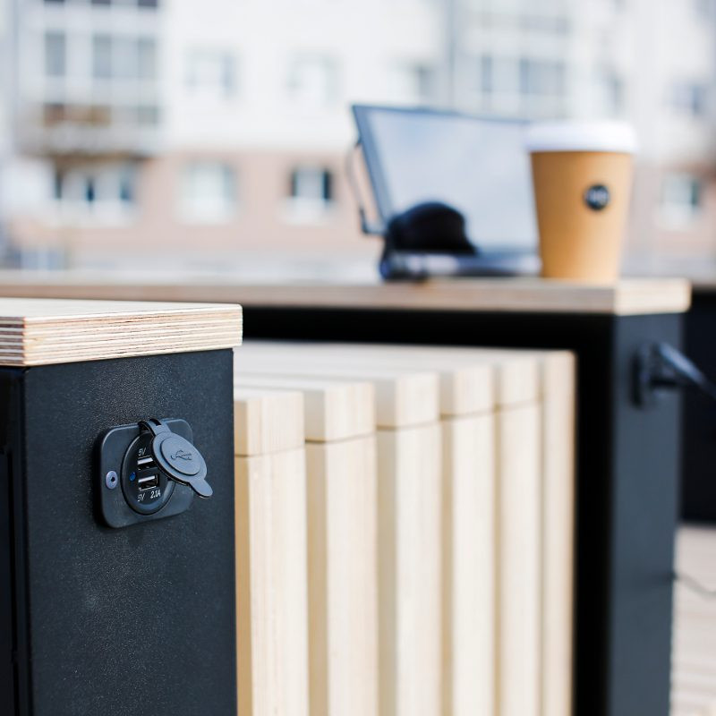Lietuvoje gaminamas lauko suoliukas su paslaugų stotele pasižymi tvarumu ir daugiafunciškumu. Elektroninį stotelės kompleksą sudaro mobiliųjų įrenginių įkrovimo įranga, LED apšvietimas, sensoriniai jutikliai, LCD ekranas metrologinei informacijai ar reklamai transliuoti, galimos papildomos garso, vaizdo stebėjimo, Wi-Fi funkcijos. Elektros energijos gavybą užtikrina įmontuotas saulės modulis. Suoliuko komplektacijoje taip pat yra reikalingiausių įrankių rinkinys dviračių remontui, skirtingų antgalių oro kompresorius ir orapūtė. Įrenginys pritaikytas regos bei judėjimo negalią turintiems žmonėms. Suoliukas su paslaugų stotele yra draugiškas aplinkai ir bendruomenei, puikiai tinka viešosioms erdvėms: aikštėse, parkuose, poilsio zonose, ugdymo įstaigų ir biurų prieigose.