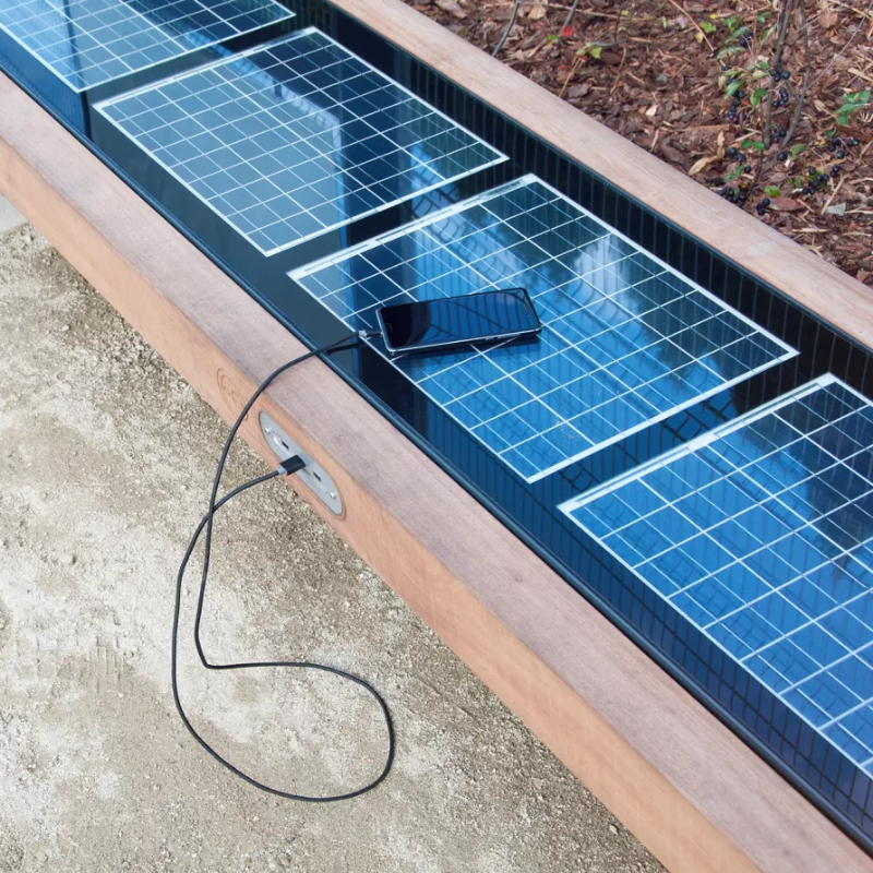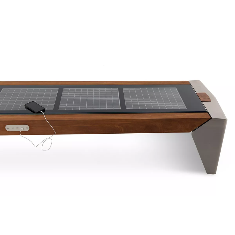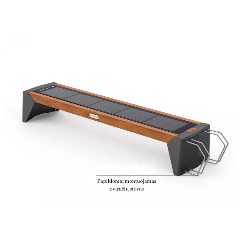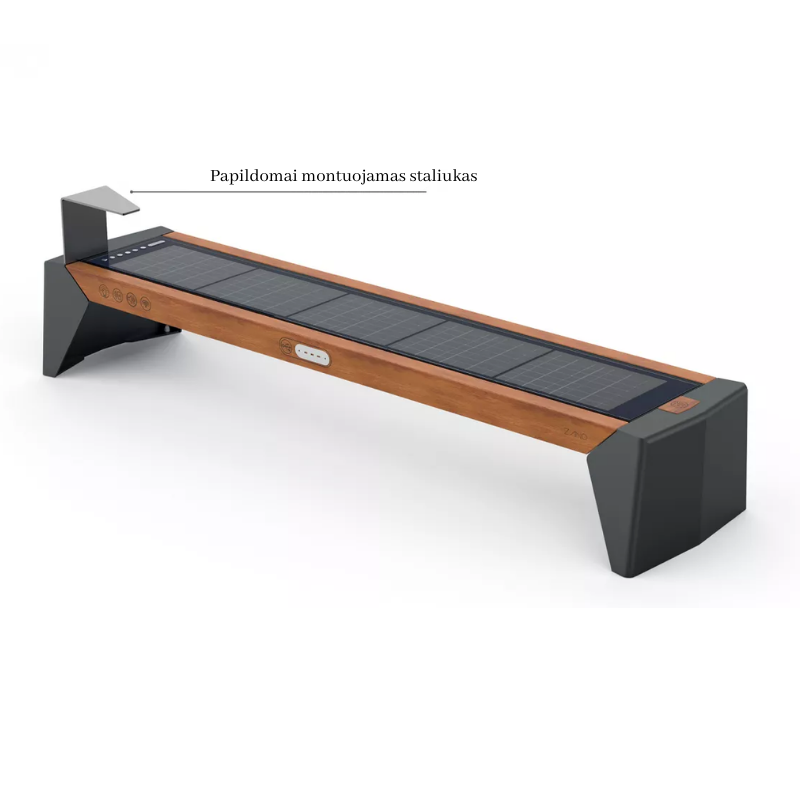 Išmanusis lauko suoliukas, sudarytas iš plieninių atramų ir medinės sėdynės, į kurią integruotos fotovoltinės plokštės, apsaugotos grūdintu laminuotu stiklu. Patvarios medžiagos ir gerai apgalvota konstrukcija garantuoja ilgalaikę apsaugą nuo vandalizmo ir kitų išorinių veiksnių. Suoliukas veikia visiškai autonomiškai, be elektros įvado, todėl gali būti montuojamas net ir atokiausiose vietovėse. Saulės energija renkama penkiomis atskiromis fotovoltinėmis plokštėmis, taip eliminuojant šešėlių įtaką. Pagal poreikį, prie suoliuko gali būti tvirtinamas kompaktiškas staliukas ir dviračių stovas.