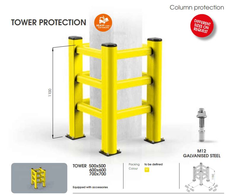 Trijų lygių kolonų apsauga TOWER pritaikyta pramonės ir logistikos bazėms, vietose kuriose vyksta autokrautuvų judėjimas. Suapvalinta konstrukcija, kompaktiška kolonos apsaugos forma. Komplektuojama kartu su tvirtinimo reikmenimis.