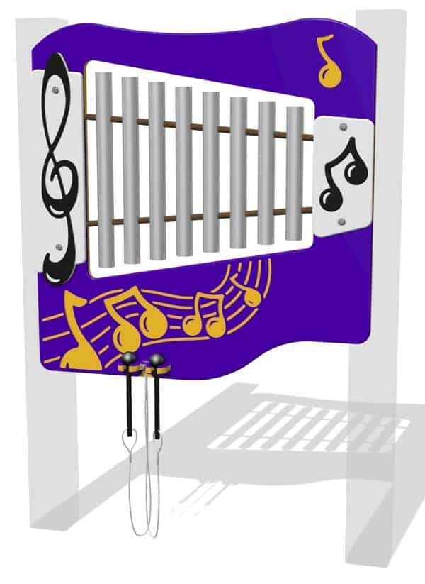 Lauko muzikos instrumentas, pagamintas iš aliuminių vamzdelių.