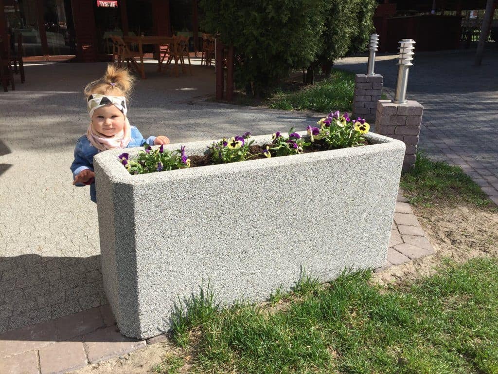 Betoniniai gėlių vazonai su natūralaus granito skaldelės apdaila.