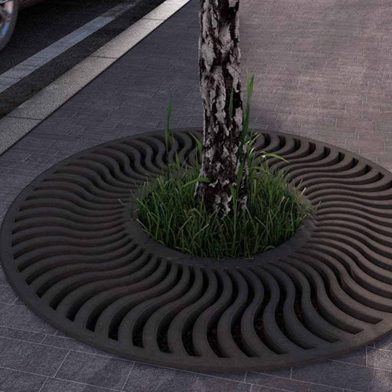Ovalo formos šaknų grotelės, pasižyminčios konceptualiu dizainu, kuriančiu sūkurio įspūdį. Šios medžių grotelės ne tik apsaugo augalus nuo aplinkos poveikio, bet ir gali pasitarnauti kaip dekoratyvinė atsvara griežtų formų ir struktūros viešose erdvėse.