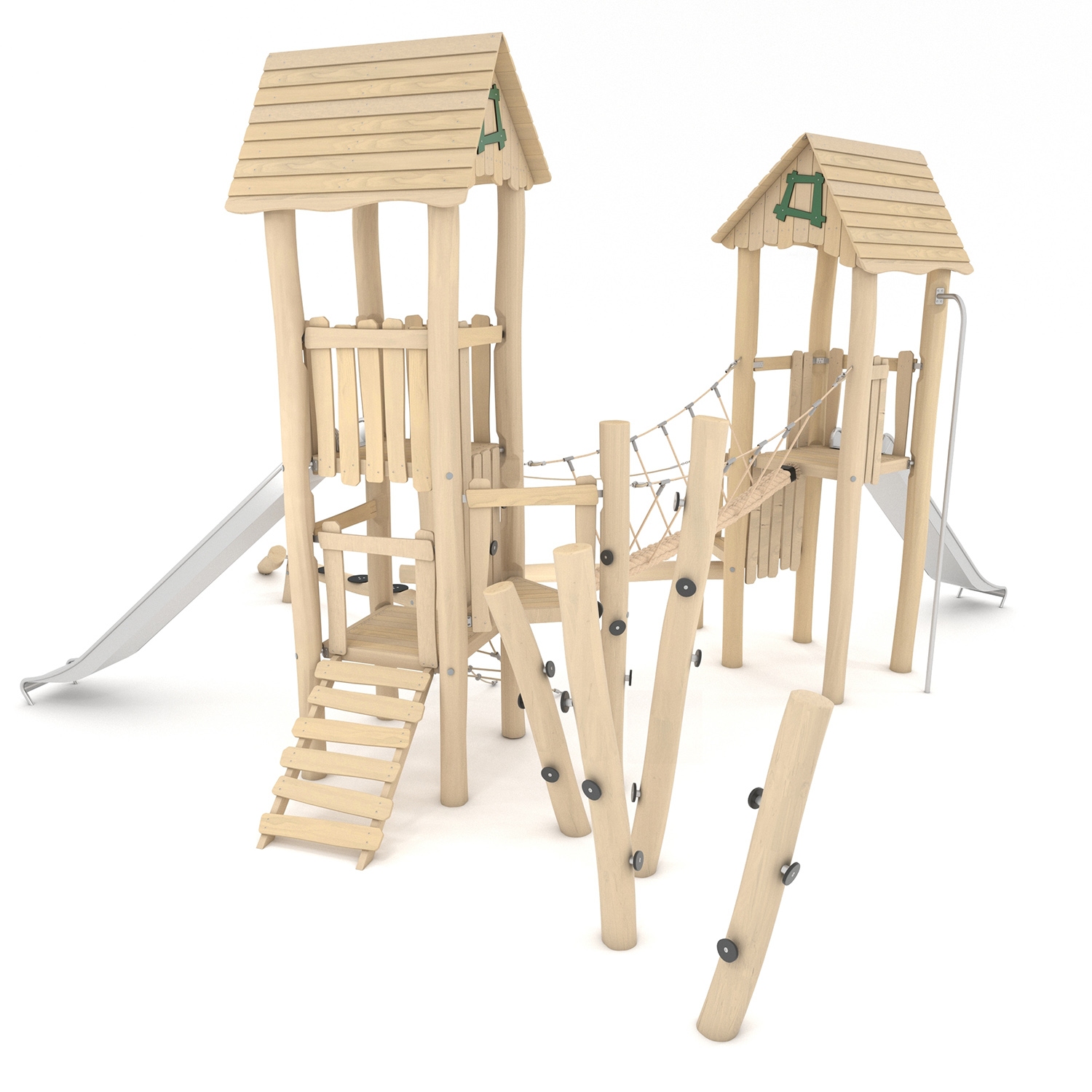 • Pagrindinė žaidimų komplekso konstrukcija pagaminta iš Robinijos – patvarios akacijos medienos (skersmuo ~ 18 cm), atsparios įvairioms oro sąlygoms;