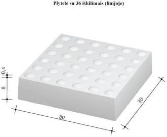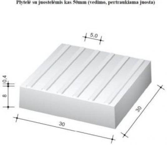 Tinkamiausias sprendimas naujai grindžiamiems šaligatviams, miesto aikštėms ir skverams. Galima instaliuoti ir esamuose šaligatviuose. Klojamos taip pat kaip ir įprastos plytelės. Plytelės – vienas greičiausių ir patikimiausių būdų įrengti neregių vedimo takus.  Siūlome ypač kokybiškas plyteles iš formuoto betono. Tinkamos šaligatviams su granitinėmis plytelėmis ar trinkelėmis, bei įprastomis betoninėmis plytelėmis. Matmenys: 30 x 30 cm, storis 8 cm. […]