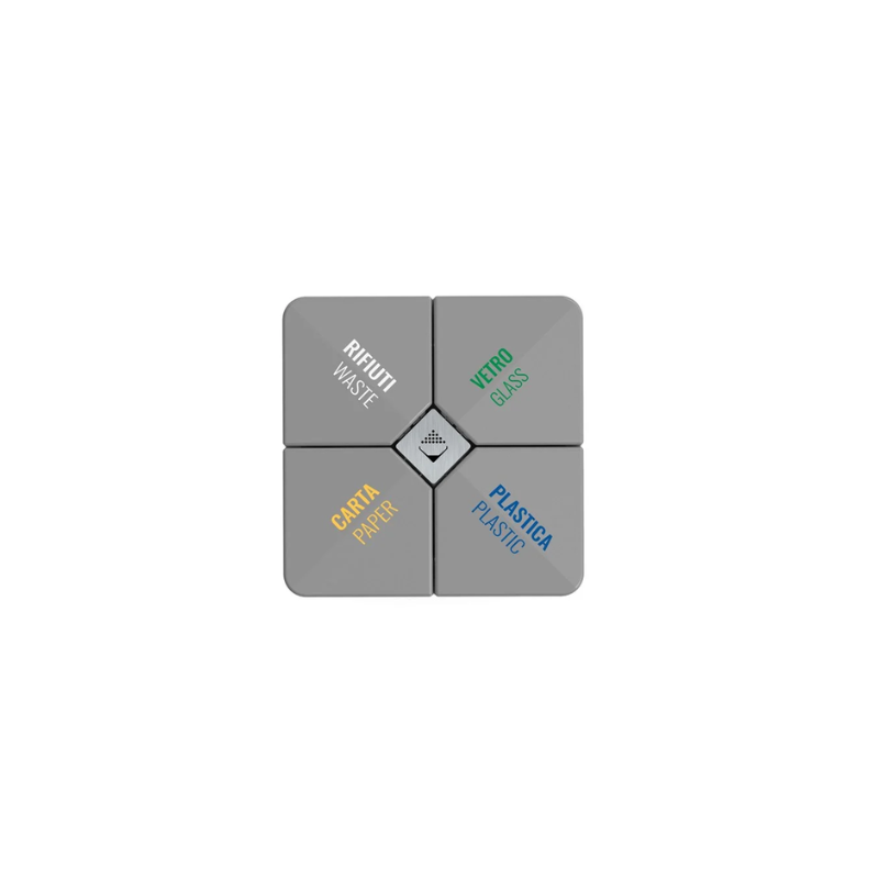 Kvadratinė šiukšlių dėžė rūšiavimui, sudaryta iš keturių plieninių konteinerių su dangčiais ir betoninio pagrindo, užtikrinančio gaminio stabilumą. Pagal poreikį, galimi įvairūs skirtingų rūšių atliekų žymėjimai: spalvoti dangčiai, spalvoti konteineriai, spalvoti konteineriai su dangčiais arba tik spalvoti užrašai. Taip pat šiukšliadėžės viršuje galima integruoti peleninę.