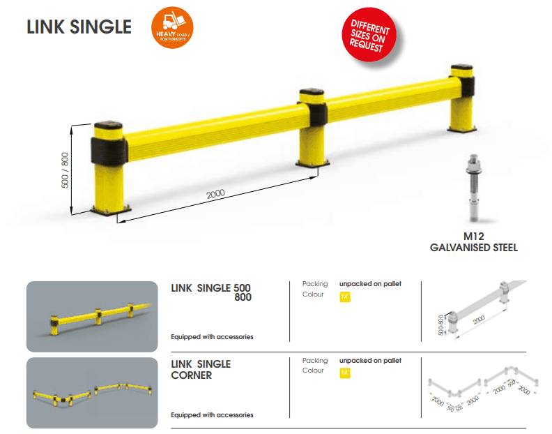 Sienų apsaugos REFLEX LINK su išorinėmis LINK jungtimis dar labiau atsparesnis smūgiams su reguliuojamu aukščiu, skirtas intensyvaus eismo zonoms. Galimi proflio išmatavimai: 2000 mm. Komplektuojama kartu su tvirtinimo elementais.