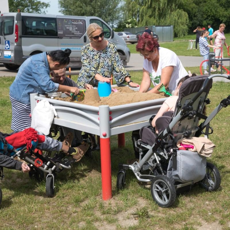 Smėlio dėžių komplektas, skirtas vaikų su negalia socialinei integracijai. Skirtingų lygių dėžės suteikia galimybę smėlio žaidimais mėgautis ir vežimėlyje sėdintiems vaikams. Taip pat tai puikus įrankis asmenų, turinčių fizinę ir intelekto negalią, terapijai, motorikos lavinimui ir žaidimams.