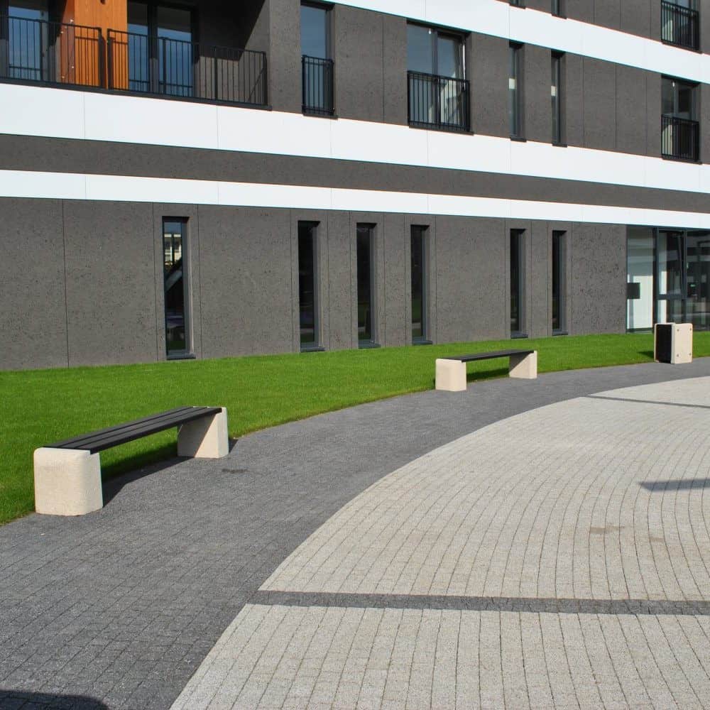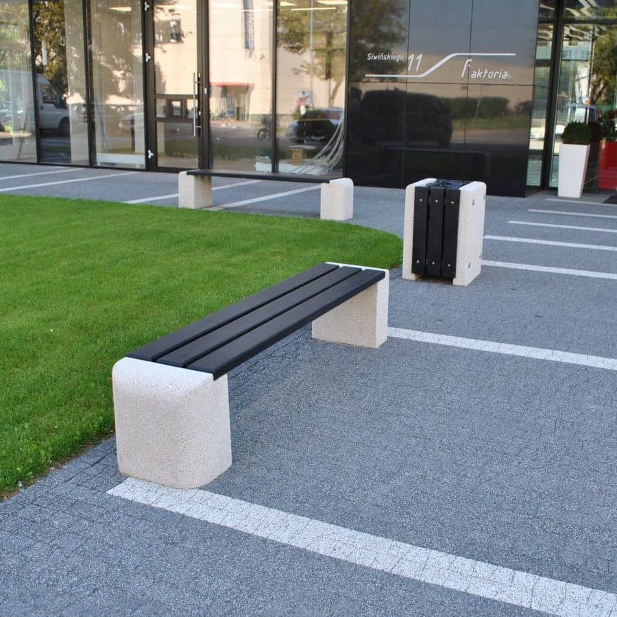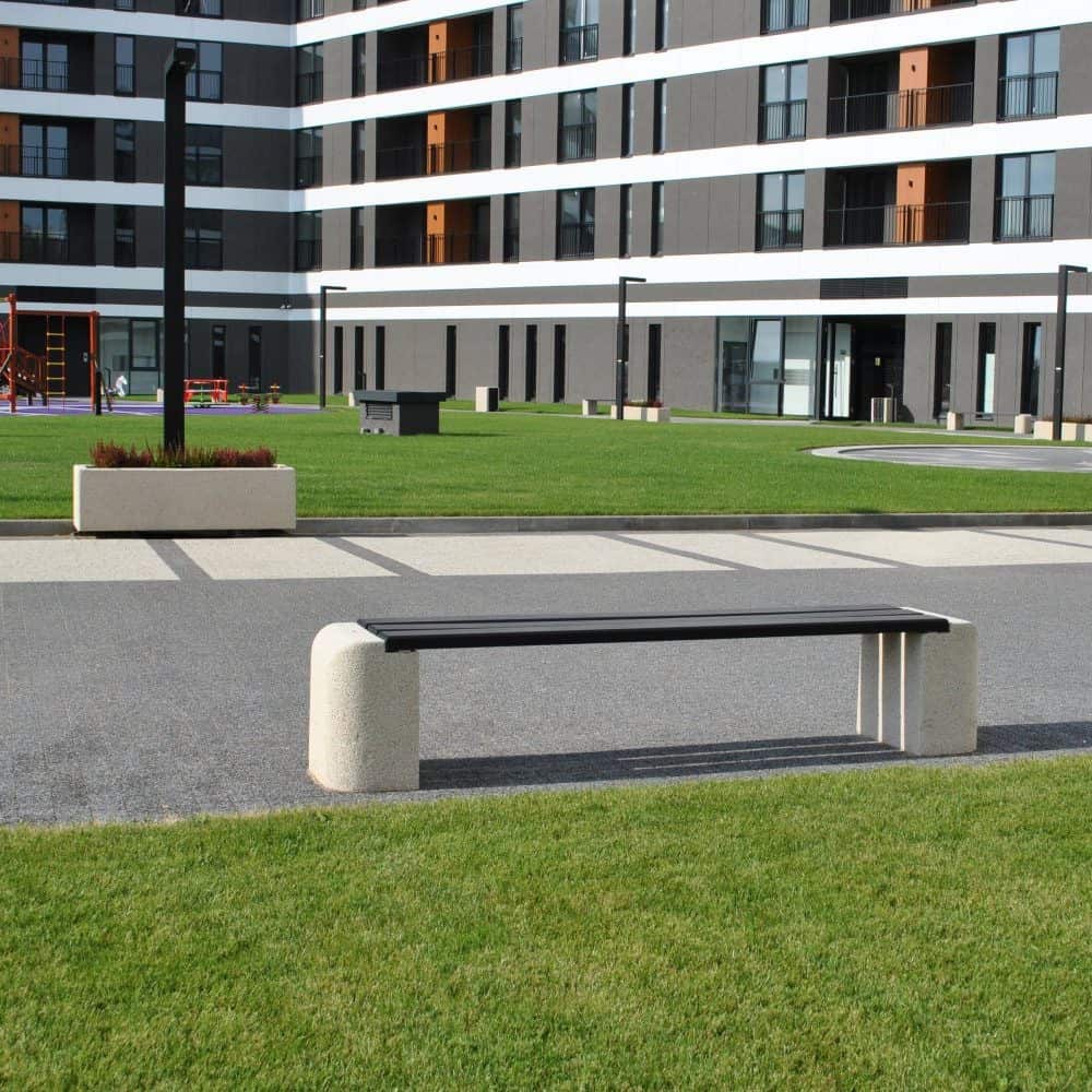 Lauko suoliukas, sudarytas iš apvalintų betoninių atramų ir integruotos medinės sėdimosios dalies. Dominuojantis betono elementas ne tik suteikia stabilumo, bet ir pabrėžia urbanistinį įvaizdį. Suoliukas dengtas natūralia granito skaldele, kurios spalvą galima rinktis individualiai.
