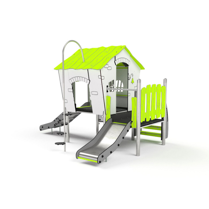 Vaikų žaidimų aikštės įrenginys, kurį sudaro žaidimų namelis, dvi čiuožyklos, laipteliai ir skirtingų lygių laipiojimo pakopos. Dekoratyviniai elementai pagaminti iš HDPE plastiko ir polikarbonato, o komplekso tvirtumą ir stabilumą užtikrina plieninė konstrukcija. Žaidimų įrenginio platformos dengtos neslystančia danga. Įrenginys atitinka LST EN 1176 standartą, tinka vaikams nuo 1 metų amžiaus.