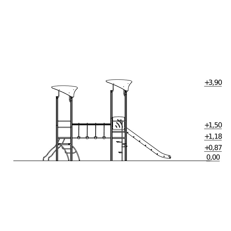 Tai multifunkcinis žaidimų aikštelės įrenginys su dviem bokšteliais, čiuožyklėle, beždžionių tiltu.