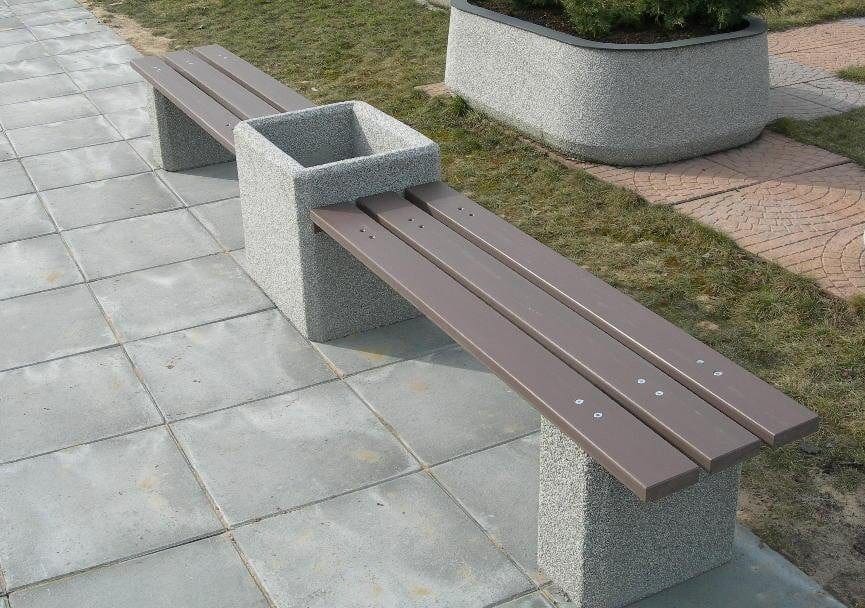 Klasikinio dizaino lauko suoliukai, sujungti betonine šiukšliadėže. Šis dviejų dalių…