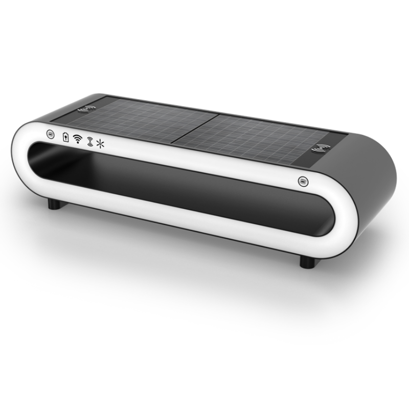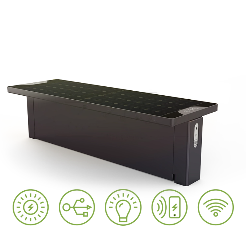 Šiuolaikinio dizaino lauko suoliukas su saulės moduliais, išsiskiriantis kompaktišku dizainu…