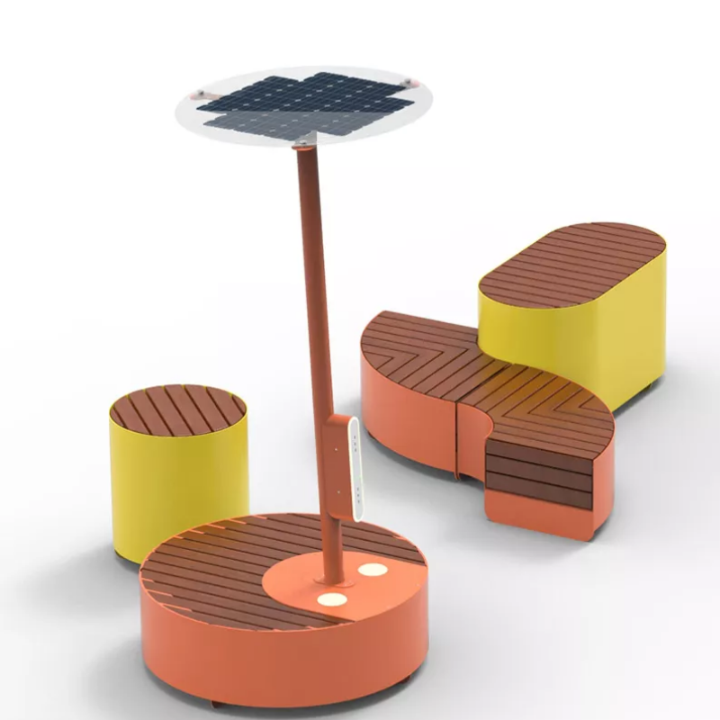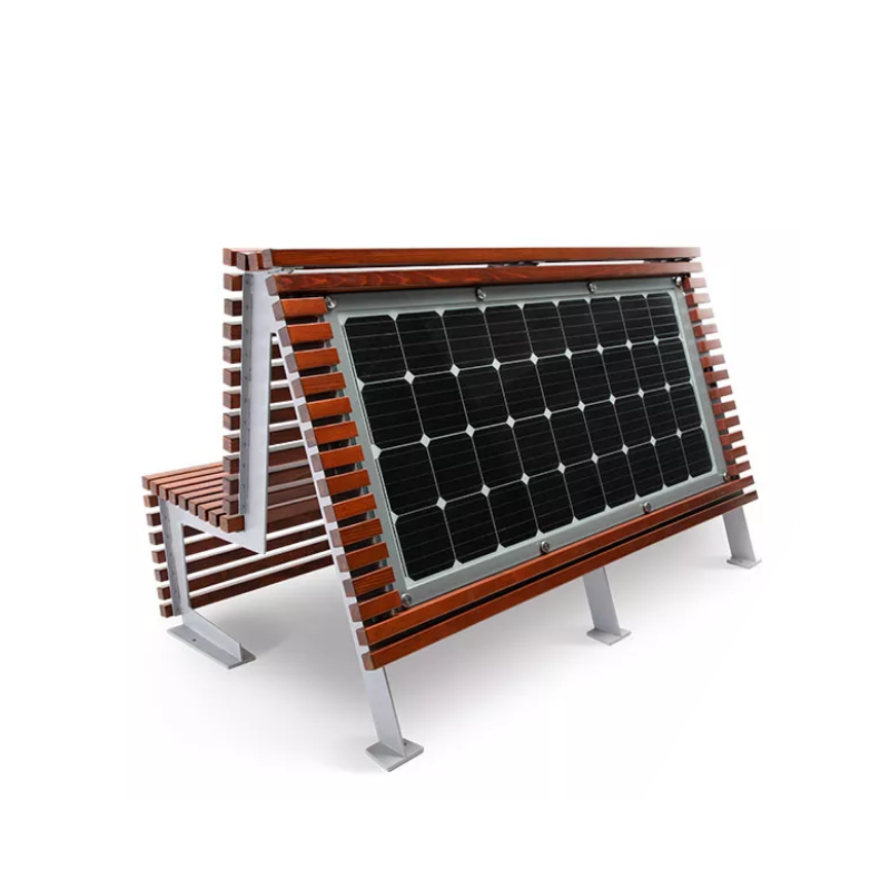 Išskirtinio dizaino lauko suoliukas su integruotais saulės moduliais, suteikiantis ne…